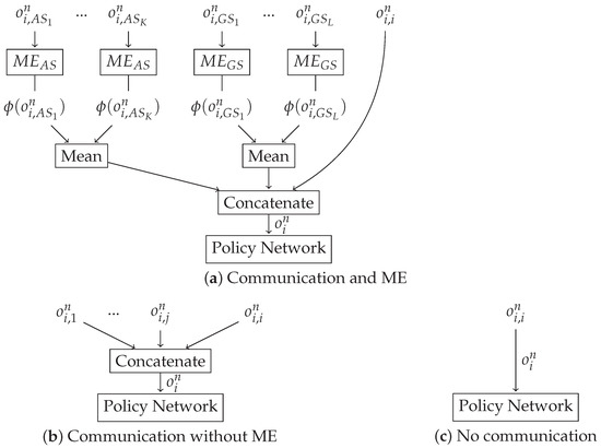 - Communication without using mean embeddings (C) setting: in this case, ASs communicate among them without using any ME to aggregate information (situation (b) in Figure 4). In this case, the input size of the policy network is equal to the dimension of and thus increases with the number of ASs, while it remains invariant for all other cases.