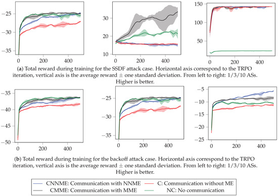 - We do not need to know the state of the system (i.e., the reputations), as DLA relies only on partial observations (i.e., information about how the sensors have interacted in the past that can be observed by other sensors). Even though we have only partial observations, they provide very good results, especially when the ASs are able to communicate their observations—in Table 2, the results using communication and ME consistently are the best. However, even when this communication is not considered—i.e., the NC setup—the results are still better than the baselines. Even though the underlying model of the attack is a POMDP, DLA learns to attack having only a limited amount of past observations. Thus, when attacking a network, if communication among ASs is possible, our results point towards using ME to aggregate the local information in a meaningful way. We test using two different ME types: NNME, which may extract better features at the cost of extra training complexity, and MMEs, which provide a lower training computational cost but obtain more limited features for the policy. The results shown in Table 2 show that both MEs provide good results, and hence, choosing between them may depend on the concrete problem to solve and the training restrictions we may have.