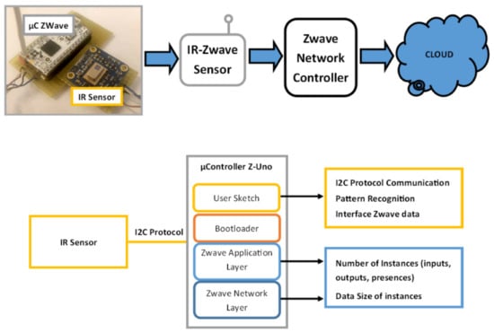 The proposed architecture is composed of three main components: a Panasonic Grid-EYE 64 pixel IR sensor array, a Z-Wave network, and a signal-processing module [25]. The infrared sensor captures the thermal image of the user’s passage, the I2C protocol passes the signal to the processing module, which implements the proposed pattern recognition algorithm, and after that, the data are sent via Z-Wave protocol to the network. These components are discussed in the following section.