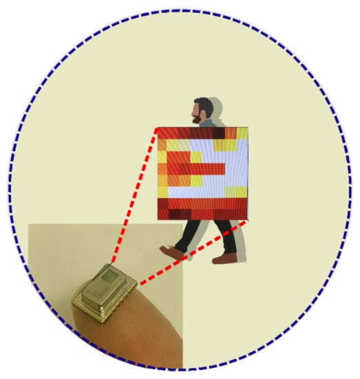 The device is constituted by an 8 × 8 array of IR sensors (64 pixels), which performs the acquisition of comprehensive temperature data, thus obtaining thermal images and temperature gradients. The sensitivity of an IR sensor derives from the photometric sensitivity of each detector at each pixel. An IR sensor has multiple pixels that all work together to create a complete view of the area. By its nature, it protects the host environment’s privacy, contrary to what is possible with conventional cameras.