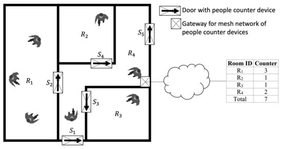 The case study under consideration, which is termed indoor people counting, is represented in Figure 3. In this case study, those responsible for safety of people within the building needs to have exact information on the distribution of the people inside the building and, in particular, the number of people for each room/corridor and the total for the building. A small device is mounted on the top of the door casing. The device has a square infrared sensor facing the floor, aligned with the door casing, and implements a pattern recognition algorithm for locally processing the sensor data, and, in the case of activation, signals which event has occurred to a mesh network with the other devices in the building. The mesh network faces a gateway connected to a cloud service that collects, processes, and stores the relevant information.