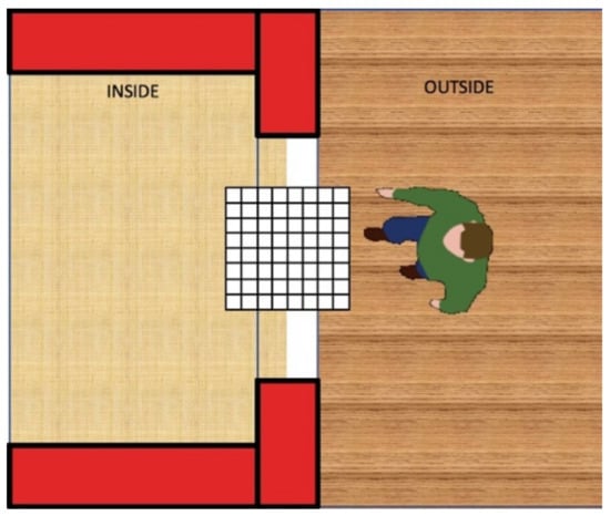 The reference scenario considered for devising the pattern recognition algorithm is shown in Figure 4. There is an IR sensor with 8 × 8 elements (the sensor in Figure 4 is magnified to show its position in the scene) fixed on the top of the doorway. With reference to the location of the sensor in Figure 4, we define “inside” of the space as on the left of the sensor and “outside” of the space as on the right of the sensor. In the figure, a subject is outside, moving to go inside. Once the subject is inside, the algorithm should signal the entrance message (E).