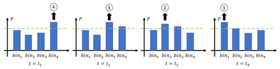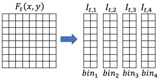 where k is a normalizing coefficient. This coefficient has been chosen through a numerical analysis of the dataset, aiming at identifying a threshold T higher than the powers (Equation (4)) of each bin without activity; the obtained value was kept constant for all the subsequent studies. When the power of a bin is higher than the threshold, we assume that a subject is passing under that bin, and the corresponding bin number is produced as output. For example, referring to Figure 6, if the subject is moving from the right to the left, the output generated after processing frame is [1–4], meaning the following conditions have been verified: , , , with . The time series of the bin levels described in this example are shown in Figure 6.