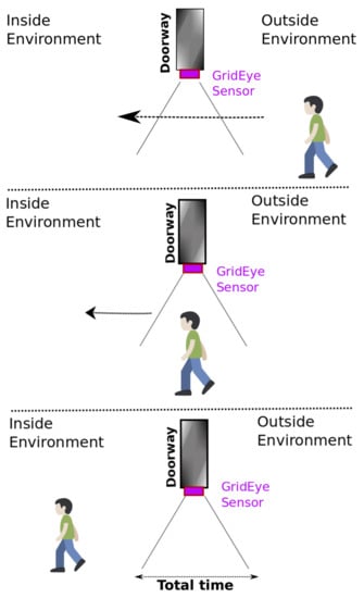 Different sequence patterns were obtained for the user’s movement in the vicinity of the sensor, for example, “input,” “fake entry,” “output,” and “fake exit,” as defined in Table 3. In this regard, in the following section, we present a detailed description of the proposed algorithm for people moving through a doorway.
