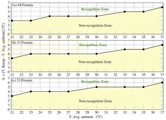 From the obtained results, we could establish that the limitations of the algorithm are strongly related to the average values of the ambient temperature and to the perturbation values. More precisely, we calculated delta (Δ) that represents the difference in temperature between the ramp and the average ambient condition. In Figure 11, we present the graph describing the variation of Δ as a function of the average ambient temperature for three different frame numbers. It is evident from Figure 11 that the algorithm can detect an event only for values greater than the minimum Δ value, specific to the average ambient temperature value. For instance, considering the event with 44 frames (Figure 11a), an average ambient temperature of 27 °C, and a ramp value of 34 °C, the value of Δ is then 6 °C, which is greater than the minimum Δ value (4 °C) required for recognition. Hence, this event is detected by the algorithm.