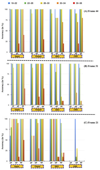 Accuracy plot for detection of four distinct human passage movement (Input, Output, IHO, OHI), at different distances (9P: 1.5 m, 6P: 5 m, and 2P: 7.5 m), and different temperature ranges (18–22 °C, 22–26 °C, 26–30 °C, 30–34 °C, and 30–38 °C); (A) 44 frames—normal, (B) 31 frames—brisk, and (C) 21 frames—running pace.
