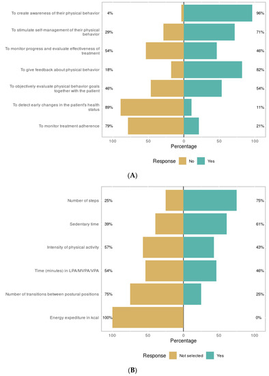 Figure 2A shows the treatment purposes of activity monitoring of the users. Almost all therapists used the monitor to create awareness for the patient with regard to their physical behavior (96%). Giving feedback about their physical behavior (82%) was also often recognized as a useful activity monitoring purpose. Figure 2B shows the activity monitor outcomes of interest during treatment. Most of them were interested in the number of steps. Additional outcomes of interest reported by users were heart rate and demands vs. capability, or in other words, the relation between what a patient did compared to what the patient was capable of.