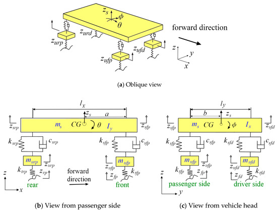 The outline of the paper is as follows. Section 2 formulates the vehicle model in vertical, pitch and roll dynamics. Section 3 describes the hybrid-mass state-variable (HMSV) method for TIPs’ estimation based on the identification of modal parameters. The structure of the DUKF for the online identification of TDPs and states is presented in Section 4. In Section 5, the proposed algorithm is verified by experimental data. Both a simulation and parameter study are shown in Section 6 to prove the algorithm’s performance in terms of sprung mass variation, model error because of linearization, and various road conditions. Our conclusion is summarized in Section 7.
