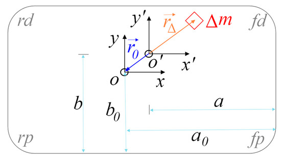 The additional mass is assumed as a rigid body, and it results in a new total sprung mass , as well as the new MIs ( and ) and the new CG displacements ( and ). The coordinate frame is at the original CG of the empty vehicle’s sprung mass, while the coordinate frame is at the new CG, as illustrated in Figure 2.