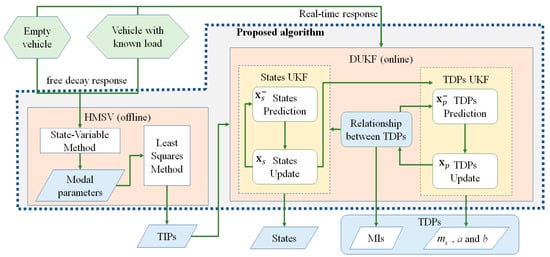 A comprehensive algorithm is proposed to estimate TIPs as well as update TDPs and online states. A flowchart of the proposed algorithm is shown in Figure 3. TIPs are estimated by HMSV based on the free decay response of an empty vehicle and a vehicle with a known load. Substituting the estimated TIPs into the DUKF, both the TDPs and states can be derived online according to the real-time dynamic response of vehicle in practical driving. An experiment is conducted to estimate both TIPs and TDPs and the test data are used to validate the accuracy of the proposed algorithm.