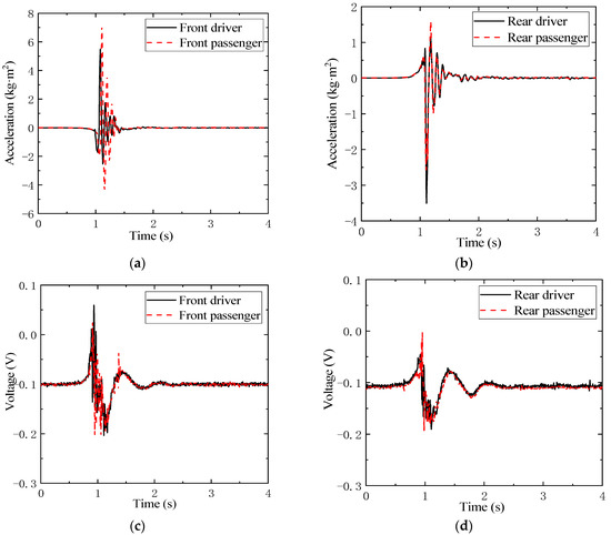 These determinable distances are listed in Table 1. Furthermore, the read data of accelerometers and LVDTs in a bounce test for an empty vehicle are illustrated in the Figure 5. It can be seen from Figure 5a,b that the acceleration values at the same axle are similar, while for a different axle they are diverse, which indicates similar stiffness and damping for suspensions at the same axle, but different suspension parameters for the front and rear axles. The data collected by LVDT are voltages, which can be transferred to compressions of each suspension.