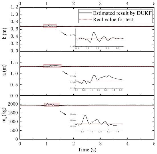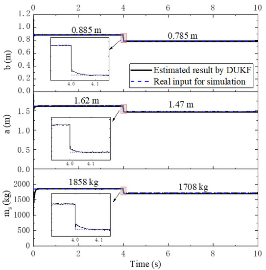 In this section, the estimation process for TDPs and states using a DUKF method are formulated in detail. For a changing loading condition, all TDPs—, , , , and (listed in Table A2 in Appendix A)—are time-dependent and need to be estimated in real-time. Among them, , and are firstly estimated by the DUKF method, and then online MIs and can be calculated by the relationship between these vehicle inertial parameters, so as to be less complex than all TDPs estimated together.