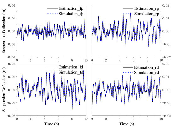 The dynamic deflections for the four suspensions can be estimated by DUKF, and their values in the mass change scenario are illustrated in Figure 8. It can be seen that the estimated values are nearly the same as the real inputs in the simulation, and even shedding a load at 4 s does not affect the estimated value by much. There is an approaching process happening near 0 s, which is because of the difference between the given initial values for DUKF and the real initial values in the simulation.