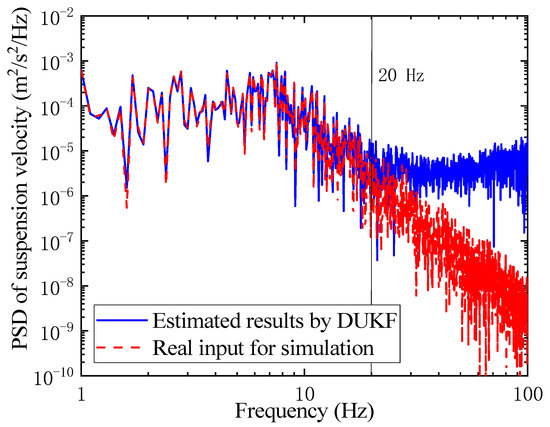 The suspension velocity can be estimated by the states UKF of the DUKF part in Figure 3. The power spectral density (PSD) values of the suspension velocity for the simulation and estimation are compared in Figure 9. It is clear that the estimated suspension velocity can approximate the real input for the simulation below 20 Hz, but in the higher frequency area, the estimated value is larger than the real input for the simulation.