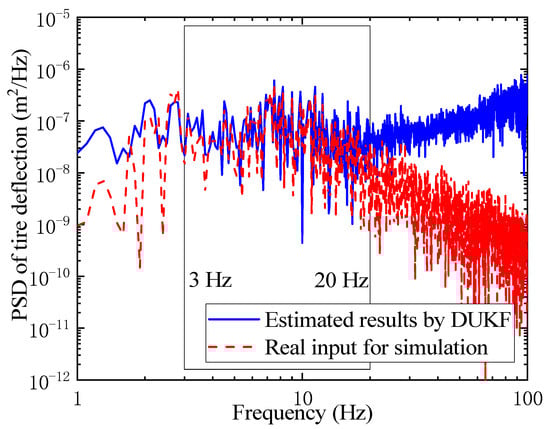 Tire deflection can also be estimated by the DUKF part without road information. The PSDs of tire deflection for the simulation and estimation are shown in Figure 10, and it can be seen that the estimated tire deflection can approximate the real input for the simulation between 3 Hz and 20 Hz. The region of greatest human sensitivity to vertical vibration lies between 4 and 8 Hz [35], while the natural frequency of wheel-hop is about 12 Hz [36], both of which are in the relatively accurate region in Figure 10. Hence, the proposed algorithm can determine accurate tire deflection information in these frequency regions of concern.