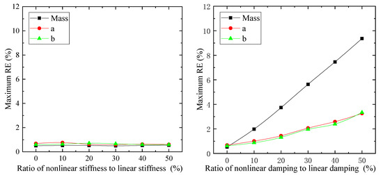 In the simulations, the nonlinear parts of the suspension—, and —are considered variables and the ratios of them to their corresponding linear parts are set from 0 percent to 50 percent, while for the estimation, only linear part values are taken into consideration. The relative error (RE) between the estimation and simulation values can be expressed as