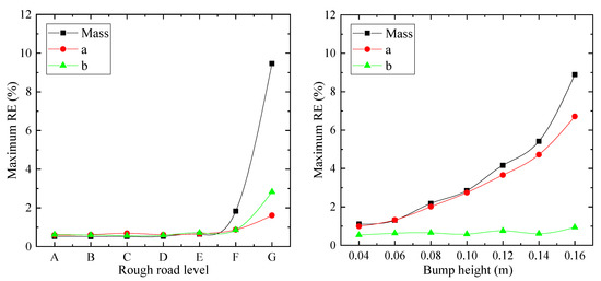 In order to study the performance of the proposed estimation method under various road conditions, the simulations are implemented on various road roughness levels (according to ISO 8608) and speed bump heights. After that, the estimation process is performed based on the simulated results. A driving speed of 40 km/h and sprung mass of 2000 kg are considered for all cases. The RE values are calculated based on the simulation and estimation results, and the maximum REs are illustrated in Figure 12. It can be seen that the proposed algorithm can maintain accurate estimation results with REs of below 5% until road roughness level F. Even though the maximum REs of reach about 10% for level G, in practice, it rarely happens that a vehicle is driving on level G under 40 km/h [39]. For the speed bump cases, the maximum REs of and increase with speed bump height. A commonly used height for speed bump is 0.07 m, on which the RE is below 2%. does not change much; this is because vehicle is driven with two coaxial wheels travelling across the speed bump together. In total, the proposed algorithm can estimate TDPs with REs of below 2% for road roughness level F and speed bump height 0.07 m, under 40 km/h.
