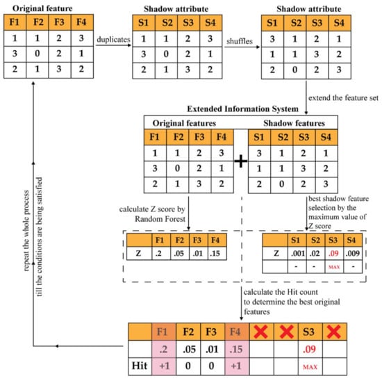 - By shuffling and permuting all the original feature attributes, it first creates a randomized copy of the original feature set. These replicated feature sets are known as Shadow Attributes (SAs). Then, these SAs are merged with the original feature attributes to form the Extended Information System (EIS) []. At least five SAs are required to form the EIS.