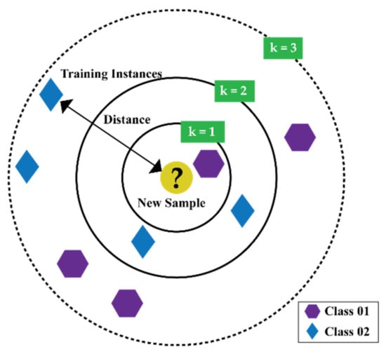 The k-Nearest Neighbor Algorithm (k-NN) is one of the simplest algorithms of ML [,]. This algorithm starts by assuming that similar things are close to each other, as described in Figure 3. Utilizing the idea of similarity based on proximity or distance, k-NN calculates the distance between two points by different approaches, i.e., Euclidian [], Manhattan []. However, in general, among all these approaches, Euclidian is the most widely used approach, which can be expressed as follows: