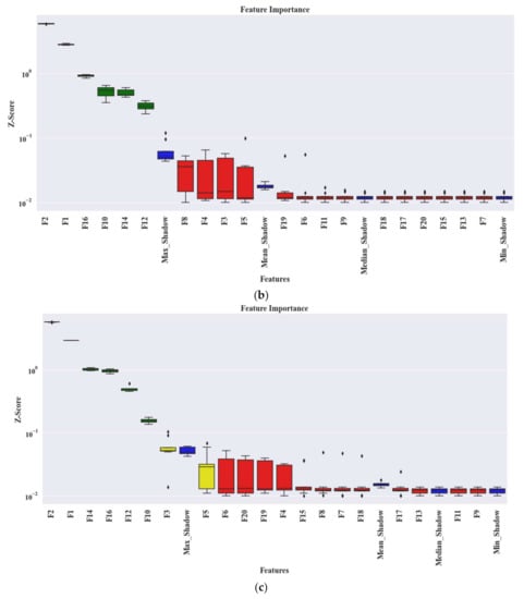 A wrapper approach usually uses a non-parametric classifier for the selection of important features from the complete feature pool. The reason behind considering a non-parametric classifier is to reduce the computational complexity [], along with avoiding the multicollinearity problem []. Boruta is a wrapper-based approach that uses the Random Forest (RF) classifier for the feature selection process. This algorithm first shuffles and permutes all the original feature attributes to create a randomized copy of original feature set. Then, this randomized set of features is added to the original feature set to bring randomness to the feature attributes. Finally, it performs the feature selection process by the RF classifier on those attributes []. Thus, by adding randomness to the feature attributes, this algorithm outperforms the conventional forward/backward selection-based wrapper approaches [,]. The steps of the Boruta algorithm are described below: