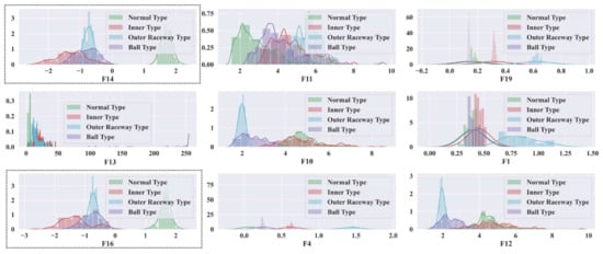 - The feature selectors available in the literature of bearing fault diagnosis are either the evolutionary algorithm-based approach [,] or the filter-based approach []. The evolutionary algorithms (i.e., genetic algorithms) select features based on the grid search and knap-snack mechanism [] with gene cross-over and mutation. Thus, the reason for selecting an individual feature attribute can never be explained or tracked down. In addition, both approaches rely on the technique of removing the redundant feature attributes from the original feature set. Moreover, several data compression techniques, i.e., principal component analysis [], and different manifold learning techniques are also used to represent the data into lower dimension for diagnosis purpose []. However, these techniques are based on algebraic calculation and geometric projection to create the separability into the feature space. Therefore, explainability remains the problem for these linear and non-linear dimensionality reduction-based techniques.