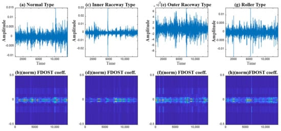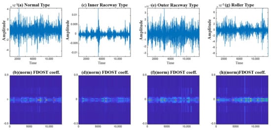 Throughout the past few years, researchers have relied on several signal processing techniques, such as Fast Fourier Transformation (FFT) [], Empirical Mode Decomposition (EMD) [], Energy Entropy (EE) [], Wavelet Packet Decomposition (WPD) [], Empirical Wavelet Transformation (EWT) [], Variational Mode Decomposition (VMD) [], and Continuous Wavelet Transform (CWT) [], as an integral part of the bearing CM-FD pipeline. One of these works is by Shao et al. [], which proposes a bearing fault diagnostic framework that analyzes the vibration signals with FFT with a Deep Boltzmann Machine (DBM). Similarly, in [], Zheng et al. introduced a multiscale fuzzy entropy-based architecture to measure the time-series complexity with the sequence of Laplacian Score (LS), and introduced a variable predictive model to create the diagnostic framework. Ali et al. proposed a feature extraction procedure by analyzing the Empirical Mode (EM) and the EE from vibration signals, and used an Artificial Neural Network (ANN) to develop the diagnostic framework in []. Furthermore, Sun et al. [] designed a fault diagnosis model for bearings by using EMD-based imaging with an improved Chebyshev distance. Likewise, in [], Cheng et al. used a CWT-based local binary pattern formation technique to develop the diagnosis framework by a Convolutional Neural Network (CNN). By introducing a WPD-based multi-scale permutation entropy with a Hidden Markov Model (HMV), Zhao et al. proposed a diagnostic framework for bearings in []. Likewise, in [], Zhicheng et al. proposed an improved version of the Empirical Wavelet Transformation (EWT) technique to capture the fault information from noisy vibration signals, and used a Support Vector Machine (SVM) to complete the task of diagnosis. Very recently, an adaptive VMD with a Teager Energy Operator (TEO) for diagnosing the incipient fault of rolling bearings was introduced by Gu et al. []. All these approaches use some signal processing techniques to extract fault-related information from the signals. Apart from these signal-based analysis techniques, several model-based theoretical approaches were studied by numerous existing literatures. In [], Immovilli et al. conducted a theoretical analysis of the physical link between faults for vibration and motor current signal, formed as a torque disturbance, and current components. Thus, they proposed a theoretical development of the correlation between torque disturbances and the amplitude of the current components. In [], by analyzing the suitable position of the flux probe for a wide range of power levels, a fault detection approach is designed based on the stray flux around the motor for ball bearing. Likewise, in [], Frosini et al. examined the possibility to employ a simple external flux coil to monitor the operating conditions of induction motors of different sizes. These approaches also provide satisfactory performance under constant speed conditions of rotary machines with variable locations of the flux probes. However, due to several factors, i.e., friction among components of a machine, misalignment, and noise, the vibration signals acquired from bearings are non-linear and non-stationary in nature, which creates difficulties when extracting and analyzing the fault feature information from different speed conditions [,,,]. Specifically, via the popular feature extraction methods which analyze features from the time domain, frequency domain, or time-frequency domain, it becomes very difficult to identify the fault characteristics for variable working conditions [,,]. To analyze such complex signals, these signal processing techniques suffer some limitations given as follow: