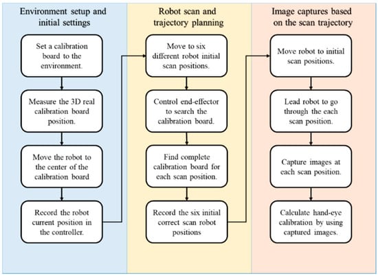 The flowchart shown in Figure 2 explains the automatic hand–eye calibration method, which is part of the position correction system. The calibration method was divided into three main stages: “environment setup and initial settings”, “robot scan and trajectory planning”, and “image capture based on the scan trajectory”. In the environment setup and initialization phase, the user must prepare the environment for calibration by measuring the position of the calibration board in the workspace, helping the arm see the calibration board and providing other simple basic settings. The robot scan and trajectory planning stage recorded the optimal end-effector position, while capturing the calibration board image at each position during the image captures based on the scan trajectory stage. The environment setup and initial settings is the only part of the system that requires manual operation (Figure 2). The proposed calibration method was implemented to initiate the position correction module to measure and compensate for the position error before defining the AOI target positions on new objects.