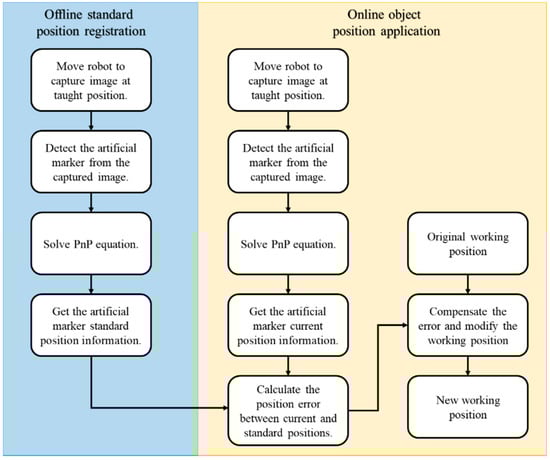 The flowchart of the proposed object correction methodology is presented in Figure 3 and is divided into the offline registration process and the real-time online object positioning. In the offline process, the user can specify the robot’s artificial marker detection position, design the marker pattern, and work points. In the online process, the system takes a picture of the artificial marker at the specific position based on the user’s offline settings. Subsequently, the system identifies the current object position and autonomously measures and adjusts the robot work points for the AOI inspection task. The position correction system is then integrated with the autonomous robot-guided optical inspection system to demonstrate the performance of the proposed system.