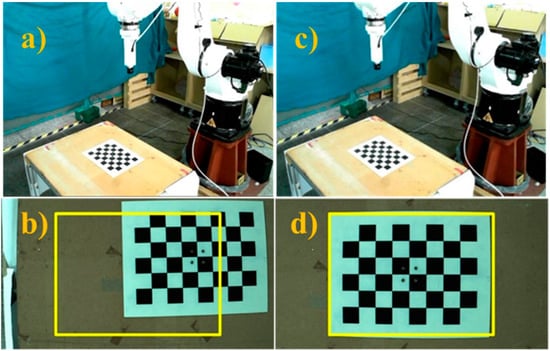 A camera installed in the working environment or mounted on a robotic arm can be categorized as an eye-to-hand (camera-in-hand) calibration or stand-alone calibration [21]. The purpose of the hand–eye correction is similar to that of the robot arm end-point tool calibration (TCP calibration), which obtains a convergence homogeneous matrix between the robot end-effector and the tool end-point [22]. However, unlike TCP calibration, it can be corrected by using tools to touch fixed points in different positions. To obtain a hand–eye conversion matrix, the visual systems use different methods, such as the parametrization of a stochastic mode [23] and dual-quaternion parameterization [24], since the actual image center cannot be used. For self-calibration methods, the camera is rigidly linked to the robot end-effector [25]. A vision-based measurement device and a posture measuring device have been used in a system that captures robot position data to model manipulator stiffness [26] and estimate kinematic parameters [27,28,29]. The optimization technique is based on the end-effector’s measured positions. However, these methods require offline calibration, which is a limitation. In such systems, accurate camera model calibration and robot kinematics model calibration are required for accurate positioning. The camera calibration procedure required to achieve high accuracy is, therefore, time-consuming and expensive [30].