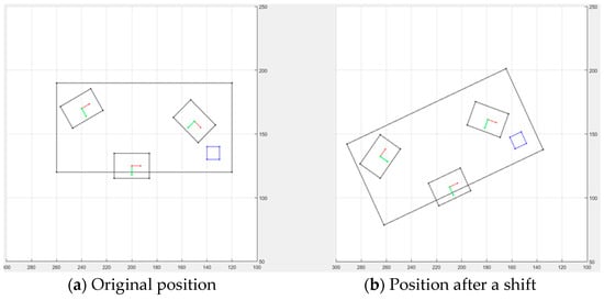 The schematic diagram shown in Figure 8 was generated using MATLAB software and was based on the proposed position correction system. In the simulation, the computer server board (object) was moved to an unknown position, after which the position correction system identified the AOI camera target point based on the artificial marker. The performance of the position correction system was high for the AOI target point and object position, regardless of the error caused by the hardware device. The system successfully found the position error and compensated for it to calculate the robot’s new AOI target point, irrespective of the object position. Thus, the object positioning correction system effectively utilized the automatic hand–eye calibration method and simple artificial markers to detect the object’s current position prior to any shifting. Section 4 discusses the integration and implementation of the proposed method in the AOI application, as well as the experimental results.