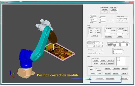 Here, we propose a novel approach to automate manufacturing systems for various applications in order to solve the object position error encountered on the production line. We developed an automated position correction module to locate an object’s position and adjust the robot pose and position in relation to the detected error values on displacement or rotation. The proposed position correction module is based on an automatic hand–eye calibration and the PnP algorithm. The automatic hand–eye calibration was performed using a calibration board to reduce manual error, whereas the PnP algorithm calculates the object position error using artificial marker images. The position correction module identifies the object’s current position and then measures and adjusts the robot work points for a defined task. This developed module was integrated with the autonomous robot-guided inspection system to build a smart system to perform AOI tasks on the production line. The robot-guided inspection system based on the offline programming (OLP) platform was developed by integrating a 2D/3D vision module [34]. In addition, the position correction module maps the defined AOI target positions to a new object unless they are changed. The effectiveness and robustness of the proposed system was indicated by conducting two tests and comparing captured images with sets of standard images. This innovative system minimizes human effort and time consumption to expedite the AOI setup process in the production line, thereby increasing productivity.