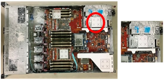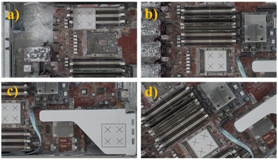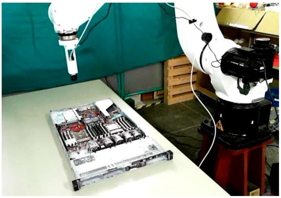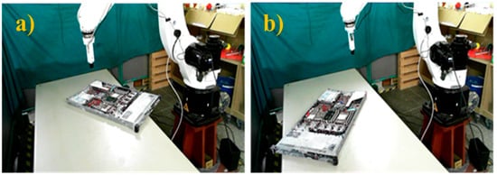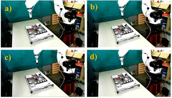 Here, we report and discuss experiments performed using the proposed position correction module for robot-guided inspection. On a production line, the robot arm employs the object position correction module to perform an AOI operation autonomously. To execute an AOI inspection, the robot arm gathers photos of the target object from various angles. If the object shifts, the proposed system detects this and adjusts the robot’s AOI image shooting position. Once positional changes are made, the system captures the defined AOI target images. The object used in this experiment was a large computer server with four artificial markers, as shown in Figure 10.