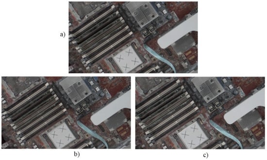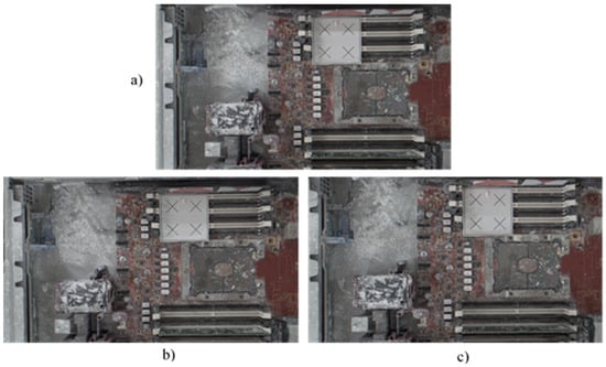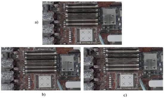 Following this preparatory procedure, the system already had all of the parameters and specification data required to perform object image repositioning. Figure 14 shows the original standard image without displacement. Two experiments with random manual displacement were conducted to evaluate the performance of the proposed position correction module, as shown in Figure 15. Once the manual displacement was carried out, the proposed position correction modules calculated the new AOI position to capture images, as shown in Figure 16, Figure 17, Figure 18 and Figure 19. These were then compared with the standard images shown in Figure 14.