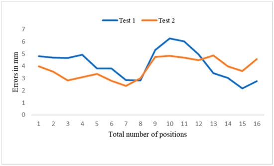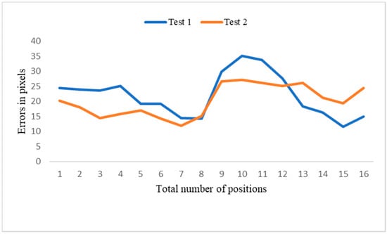 Two experiments were conducted to measure the performance of the position correction system. In test 1, the object was moved by 49.1 mm, with a final average residual error of 5.15 mm, and the proposed system compensated for 91.5% of the position error. In test 2, the object was moved 50.6 mm, with a final average residual error of 3.80 mm, and the proposed system compensated for 92.5% of the position error. New images were captured and compared with the standard images for the two random object positions. The captured images differed slightly from the standard image. These results demonstrate that the proposed system efficiently compensates for most of the error caused by object displacement. Table 4 presents the error analysis of the object position correction system, in which new images have a distance error (norm) of 10–40 pixels compared to the standard image (Figure 20), with an average of 21.09 pixels. The errors measured in pixels were then converted to mm (Table 5). The distance error was between 6 and 2 mm (Figure 21) and the mean error was 3.97 mm. The proposed method’s efficiency could be improved by accurately positioning the camera and replacing the 3D print camera holder, as well as minimizing calibration error, which may improve system accuracy by up to 95.3%. The developed system resolved the issues associated with the object translation or rotation error in the production line. The robot-guided inspection system with position correction module enhanced the ability to perform user-defined AOI tasks autonomously on any production line.