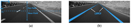 In order to accomplish such an LP fitting, the first step is to identify the two areas of interest (Lane Boundary Region of Interest (LBROI)) within the current frame (Figure 5b).