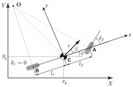 In order to compute the motion equations for the kinematic model, the bicycle model reported in Figure 10 is usually used [32]. In this figure, two coordinate systems are highlighted: the world coordinate system () and the body-fixed coordinate system (). The major assumption in the correct use of the kinematic model is that the velocities at the points A and B are always oriented in the direction of the wheels’ orientation, i.e., this corresponds to assuming that the wheel slip angles are zero, a condition that almost holds true at low speeds. The total lateral force needed to ride a circular road of radius R is given by the following: