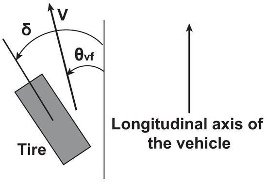 In Equation (10), two terms contribute to the lateral acceleration (): the acceleration due to the motion along the y-axis () and the centripetal acceleration (). Furthermore, the lateral tire forces are proportional to the slip angle that is defined as the angle between the orientation of the tire and the orientation of the velocity vector of the wheel (see Figure 11).