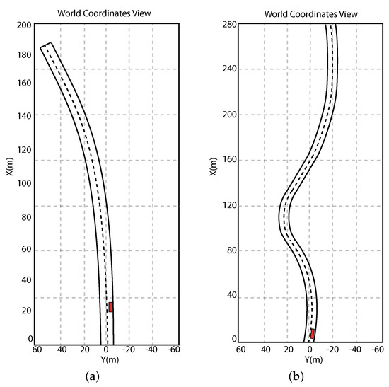 The first simulation scenario refers to a driving condition where the autonomous vehicle must turn left on a road. Details about this scenario are reported in Figure 15a. In this condition, the autonomous vehicle must be able to perform the necessary actions allowing the car to ride on the road without taking risks. Then, the onboard electronic devices and the electronic control unit must accomplish the following tasks: