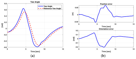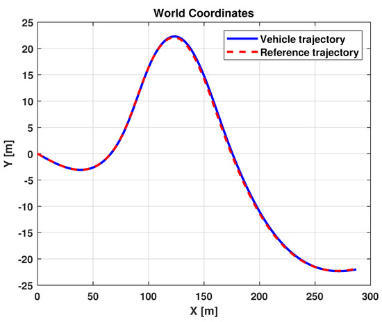 The results related to this scenario are reported in Figure 16 and Figure 17. In particular, Figure 16 shows a comparison between the reference and the vehicle trajectories in the world coordinates. From this figure, it is evident that the proposed algorithm allows for good performance to be achieved in terms of trajectory followed. This result is also evident in Figure 17a,b, where a comparison between the reference and the measured yaw angle (a) and the position and orientation errors (b) is reported. A more quantitative comparison is reported in Table 3, where the error variables (Equation (13)) averaged along all the simulation time steps are reported.