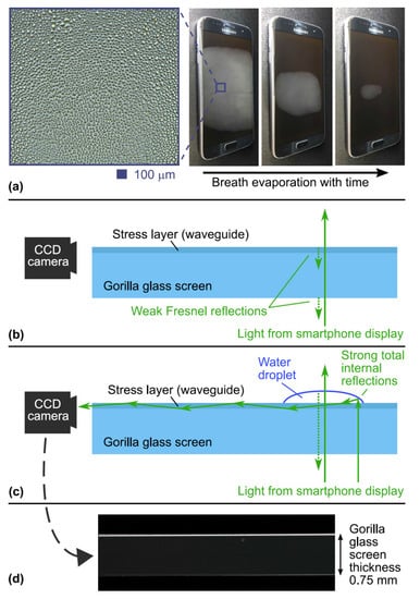 Our optical breathalyzer is based on the evaporation rate of water vapor from the breath. As shown in Figure 1a, when a person fogs a glass window (e.g., a smartphone screen) with their breath, thousands of microdroplets are formed on the glass surface. The evaporation rate of the microdroplets depends on the alcohol concentration in the breath [], which is linked to the BAC [,,,,,,,]. On a dry screen, light from the smartphone display crosses the glass screen, and only a small part is reflected (Fresnel reflection) back to the display; see Figure 1b. As shown in Figure 1c, when a droplet is formed on the glass screen, part of the light is guided toward the edge of the glass screen (as in an optical fiber). Indeed, the edge of the droplet allows a strong oblique reflection (total internal reflection) which can be coupled into the planar waveguide formed by the dense antiscratch stress layer. This stress layer is found in multimedia device screens made of toughened glass, such as Corning Gorilla® and AGC Inc. (Tokyo, Japan) Dragontrail® glasses. Note that ray optics is insufficient to treat this coupling behavior with the planar waveguide. Using wave optics permits us to see that light sources near the waveguide interface can interact with the evanescent field tails of the waveguide modes, and hence, can transfer some of their power to them [,]. Therefore, only the light reflected from the very edge of the water droplets can be efficiently coupled to the planar waveguide at the surface of the glass screen. This is the key principle of our optical breathalyzer. Recent work has demonstrated the integration of invisible photonic devices and sensors in smartphone screens using laser writing of optical waveguides [,,,]. However, the complexity of laser writing added to the use of an external light source increase the cost and the mass production complexity. In our approach, the use of the display light already present and the stress layer planar waveguide greatly simplify integration into smartphones.