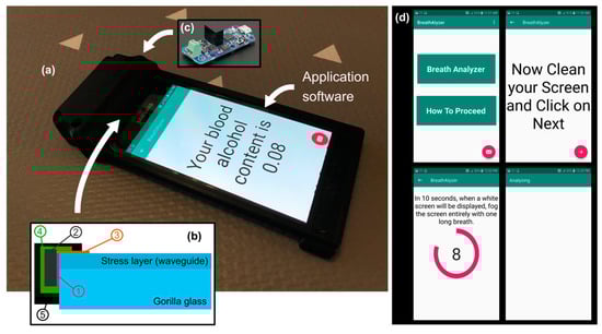 The optical breathalyzer prototype. (a) Photograph of our prototype. (b) Scheme of the photodiode installation on the side of the glass screen. (c) The electronics. (d) Screenshots of the application software steps before displaying the BAC result shown in (a).