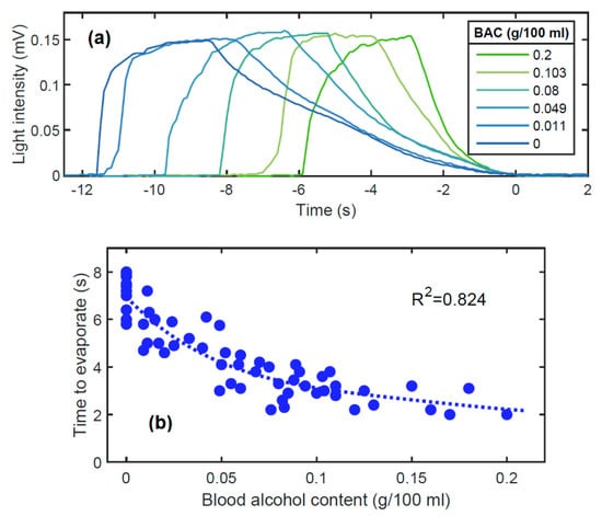 (a) Light intensity curves measured at the photodiode for different BACs. (b) Good correlation (R2 = 0.824) between the breath evaporation time and the BAC in laboratory environment.