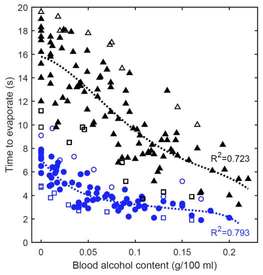 As shown in Figure 4, the breathalyzer is not accurate in real-world situations without postprocessing the data (R2 = 0.170 for n = 140). In fact, an evaporation time of over 10 s can be obtained from a BAC of 0.15, while an evaporation time of 5 s can be obtained from a sober person. However, considering a few simple parameters, the correlation can be greatly improved. By comparing the values in Figure 4 with the same ambient humidity, the coefficient of determination increases to R2 = 0.617 in the public place (blue markers) and R2 = 0.614 in the house (black markers). The humidity was 0.32 in the public place and 0.53 in the house, measured with a household hygrometer (Bios Weather). In addition, by simply discarding atypical data, as previously discussed (empty markers in Figure 4), the coefficient of determination increases to R2 = 0.793 in the public place and R2 = 0.723 in the house, which is evidencing the room for improvement that could be provided by appropriate postprocessing. We are currently investigating different approaches to address this issue.