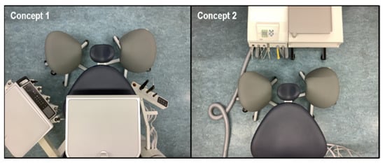 For the biomechanical measurements, 15 (12 males/3 females) oral and maxillofacial surgeons (age: 36.2 ± 9.2 years) were invited to participate in this pilot study. The dentists worked as oral and maxillofacial surgeons in established dental practices. The participants had, on average, a working experience of 9.5 ± 8.7 years. Inclusion criteria were right-handedness of the surgeons and the ability to treat in both dental treatment concepts named “treatment concepts 1 and 2” (Figure 1). Exclusion criteria included current injuries to the musculoskeletal system (e.g., herniated discs and spinal injuries), rheumatic diseases, severely restrictive malformations (scoliosis) of the spine or stiffened spinal joints (pathological or surgical), genetically determined muscular diseases, and surgery less than 2 years ago. The study was approved by the Ethics committee of the Department of Medicine of the Goethe University Frankfurt am Main (Germany) (No. 356/17).
