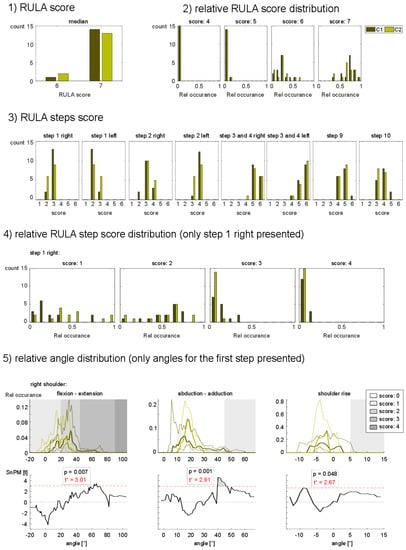 With increasing complexity and increasing resolution, smaller details were detected in our study. For the relative RULA step score occurrence and the relative angle distribution, some significant differences between the two conditions were found. For instance, the relative occurrence of the score 3 was significantly different for the RULA step 1, right shoulder. This difference might be related to the significant different cluster of the relative angle distribution (Figure 5—level 5 center). Treatment concept 2 (bright green) had a smaller angle distribution with an ROM around 10° to 30° for the abduction, while this angle ranged from ~5° to 50° for treatment concept 2 (dark green). The distribution showed a significantly different cluster in the range of 40° and 50° abduction, even though it was very variable for different subjects.