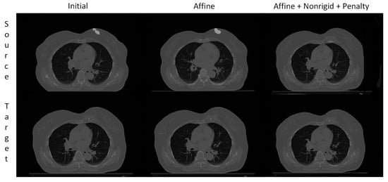 The proposed method consists of several steps: (i) preprocessing, (ii) multilevel, iterative affine registration, (iii) multilevel, DL-based nonrigid registration with the volume penalty. We decided to use the traditional, sequential approach instead of the end-to-end DL-based approach [] because the affine registration requires a substantially larger amount of training data compared to the following nonrigid step. As a result, large overfitting was observed. Moreover, the iterative affine registration can be performed relatively fast because the input images can be effectively downsampled without decreasing the registration quality. The pipeline is shown in Figure 1, the exemplary visualization of the image after each step is shown in Figure 2.
