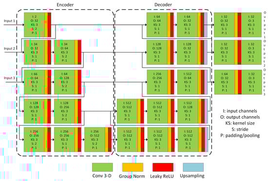 The nonrigid registration is performed by a U-Net-like [] deep neural network with skip connections. The network is presented in Figure 3. The main architectural changes were motivated by the works introduced in [,]. The network takes as the input resolution pyramid with 3 levels, concatenates the resampled source/target images, and forwards them to the encoder’s corresponding level. Similarly, the decoder outputs the deformation field at the finest level and for each level of the resolution pyramid. This approach guides the optimizer during training, enabling faster convergence and making it easier to recover larger deformations. Additional modifications of the architecture include the use of group normalization [] instead of the batch normalization, the use of leaky ReLU, and the trilinear upsampling instead of the transposed convolutions. The group normalization is applied because of the small size of the training batch. The fixed upsampling is used to: (i) diminish the checkerboard artifacts appearing in the calculated deformation field, (ii) an observation that the deconvolution with larger kernel size (divisible by the stride to reduce the artifacts) was harder to train without overfitting.