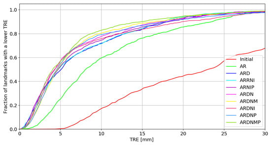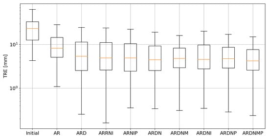 The TRE, together with the Dice coefficient, are the most frequently applied evaluation metrics in the medical image registration []. However, the situation in the presented study is quite different. The TRE should be interpreted with care, keeping in mind that the correspondence cannot be directly estimated between the tumor in the moving image and its bed in the fixed image. The cumulative histogram presenting the TRE for different methods is shown in Figure 4. The box plot showing the TRE is presented in Figure 5. The TRE is also summarized in Table 1.