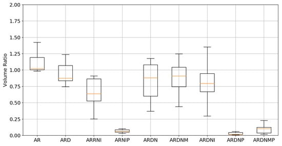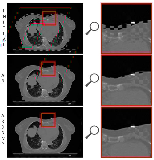 We decided to perform the following experiments: (i) affine registration based on the instance optimization (AR), (ii) AR followed by the classical Demons algorithm (ARD) [], (iii) AR followed by the nonrigid registration based on the instance optimization (ARRNI) [], (iv) ARRNI with volume penalty (ARNIP), (v) AR followed by the simple U-Net architecture for nonrigid registration (ARDN) [], (vi) AR followed by the multilevel U-Net architecture for nonrigid registration (ARDNM) [], (vii) ARDN with the additional inverse consistency (ARDNI) [], (viii) ARDN with the volume penalty (ARDNP), (ix) ARDNM with the volume penalty (ARDNMP, proposed in the article). All experiments share the same hyperparameters. Please note that AR, ARD, ARRNI, ARDNM and ARDNI denote the state-of-the-art approaches that are not proposed in this study.