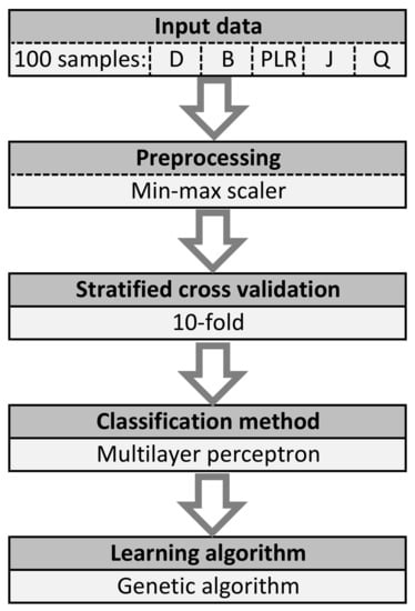 - Preprocessing: One rescaling algorithm was used, i.e., min–max scaler. Thanks to the use of this algorithm, data was obtained in a specific range of values. The presented method uses the scaling to values in the range of 0–1.